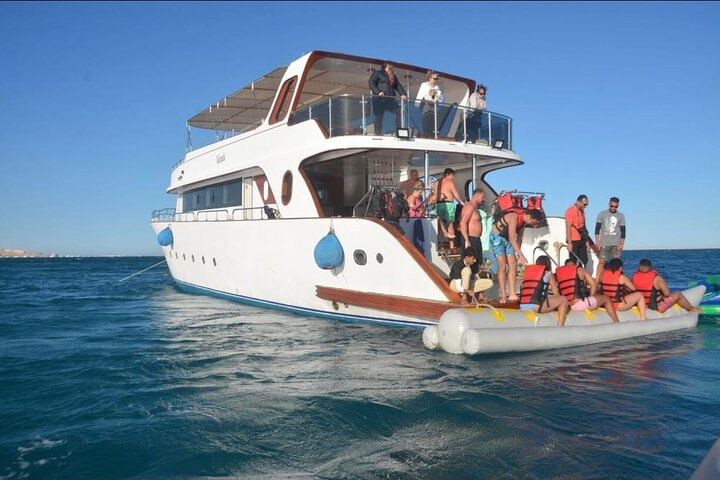 Enjoy a full-day to Hula Hula Island & Magawish Island at the same day in Hurghada! Start with a hotel pickup and a scenic cruise, Snorkel in crystal-clear waters, ride the waves on a Banana Boat, and relax with lunch and beach time on the island. Return to your hotel by 5:00 PM after a day of fun and exploration.